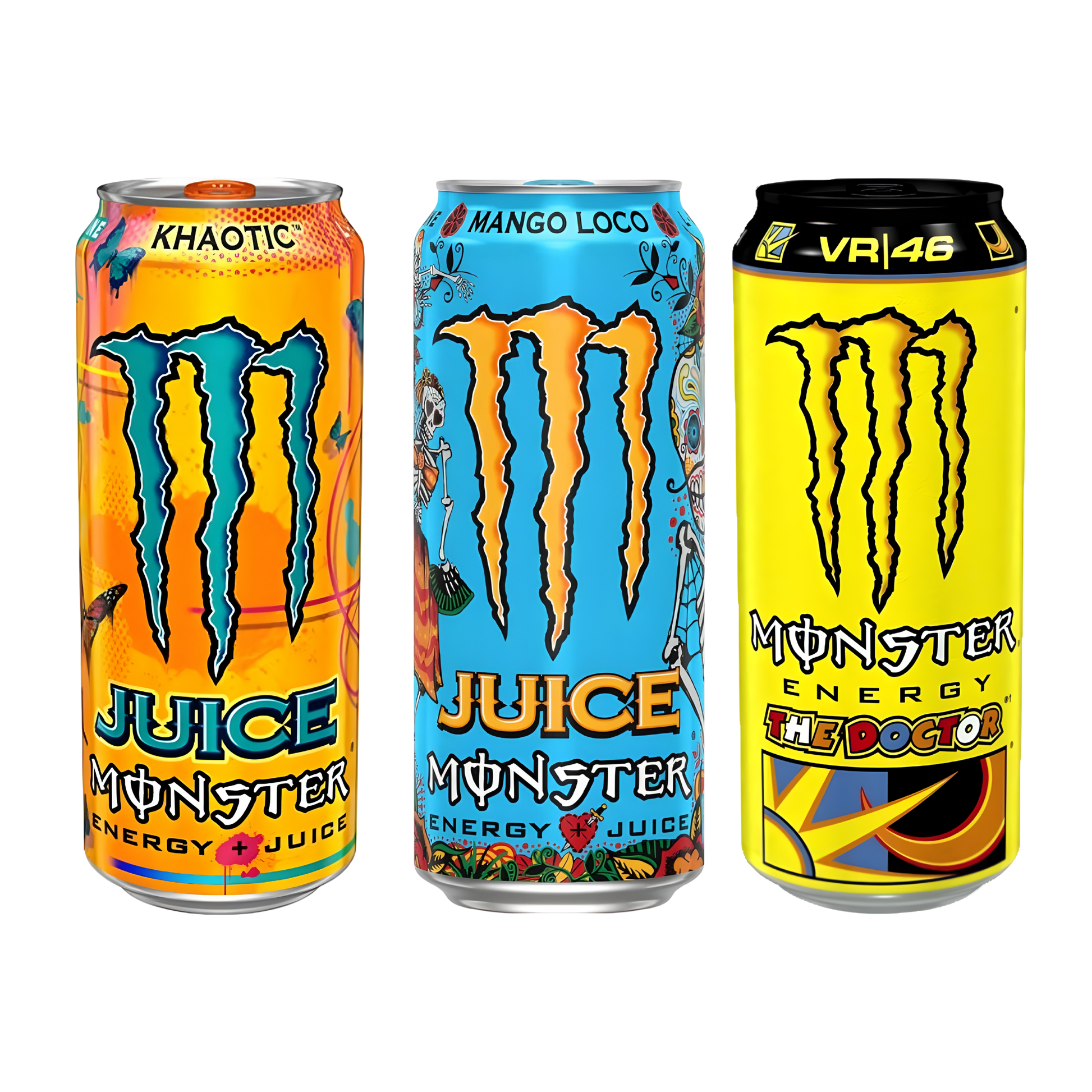Pick any 3 imported Monster Energy flavours to create your personalized tasting set. Choose from Gold, White, VR46, Pipeline Punch, Khaotic, Mango Loco, Ultra Peach, and MIXXD.