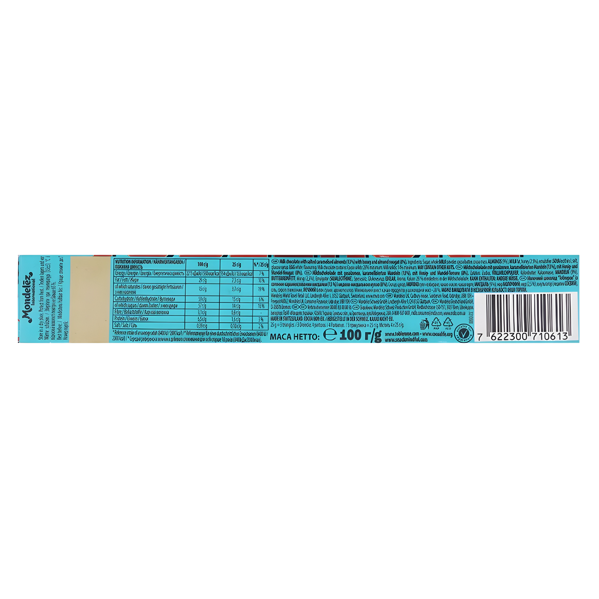 Enjoy Toblerone, the iconic triangular chocolate from Switzerland, with a twist. The beloved Toblerone milk chocolate is now enriched with the crunchiness of caramelized almonds and a suprising drop of salt. The 100g format is a perfect size for a snack with surprising taste.