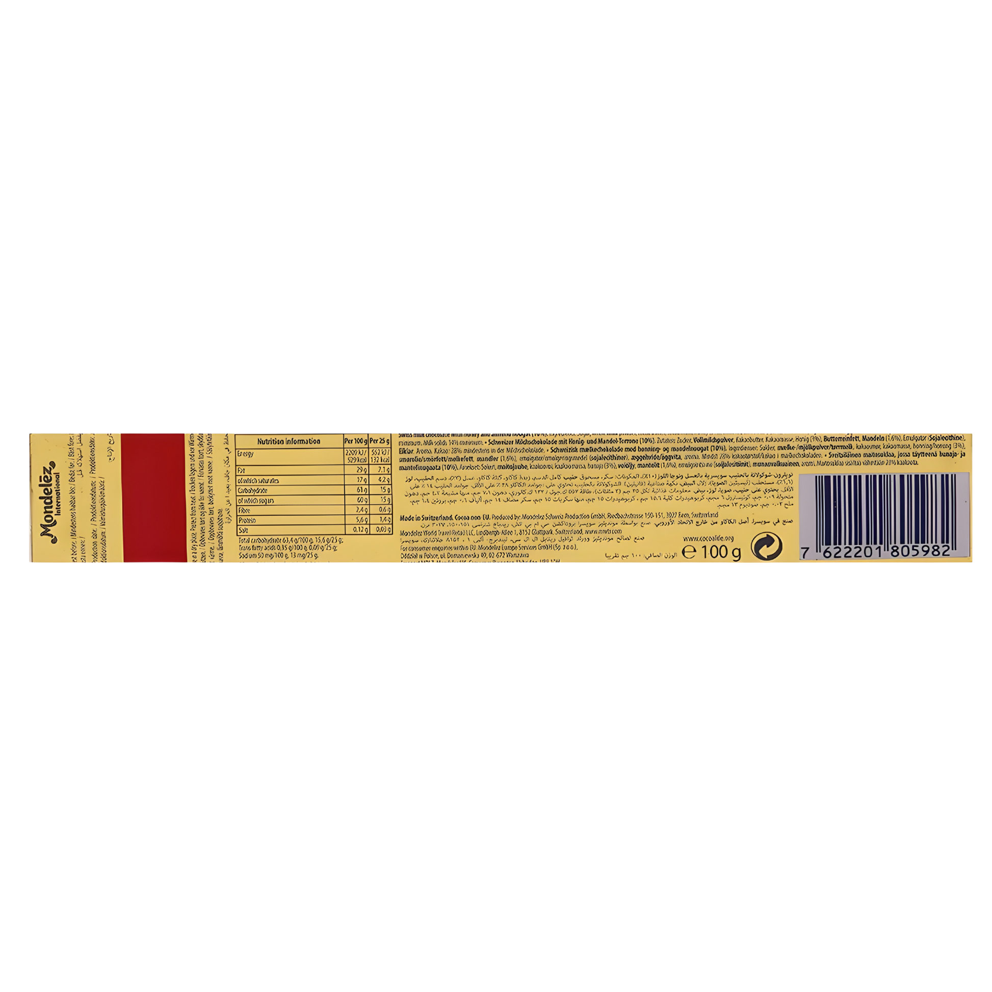 Enjoy Toblerone, the iconic triangular chocolate from Switzerland with Honey and Almond Nougat. This pack contains 100g Toblerone Milk Chocolate - an ideal treat for sharing and snacking while traveling or at home.